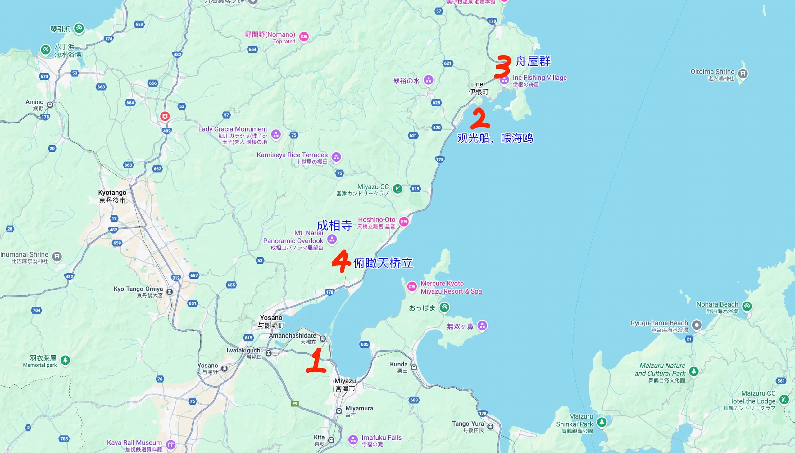 乘坐伊根方向的巴士前往这些地点。